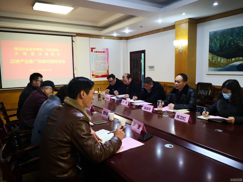 2021年3月19日下午,财经学院院长徐斌华率项目组成员接待了大悟县妇联主席曾彩霞等一行人,在文华楼二楼会议室,双方就如何推广汉绣产业等问题进行了深入的交流探讨。