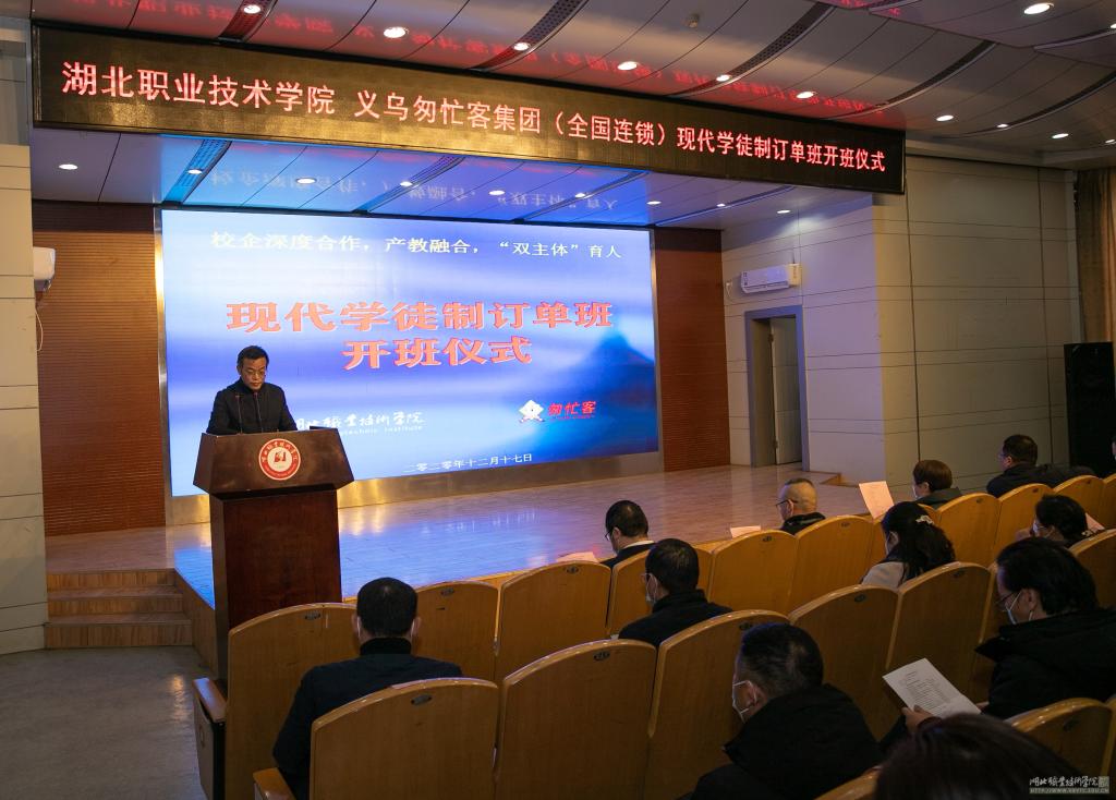 12月17日下午,学校与义乌匆忙客集团“现代学徒制”订单班开班仪式在文博馆学术报告厅顺利举行。浙江义乌匆忙客集团管理团队盛等财副总经理一行6人,学校校长朱虹、副校长梅重、相关职能处室负责人,财经学院、旅游与酒店管理学院师生代表等参加了相关活动。学校教务处处长黄享苟主持开班仪式。