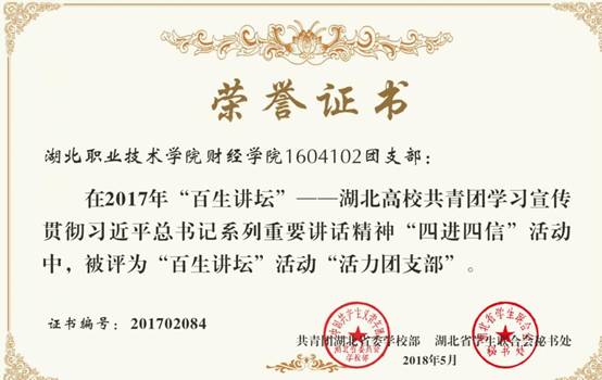 日前,财经学院收到共青团湖北省委学校部、湖北省学联秘书处联名颁发的荣誉证书,1604102班团支部在2017年“百生讲坛”-湖北高校共青团学习宣传习近平总书记系列重要讲话精神“四进四信”活动中被评为“百生讲坛”活动“活力团支部”。
