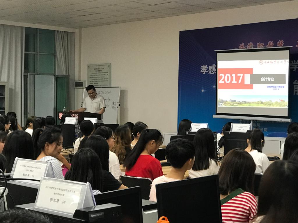 九月十三日晚七点,在文华楼三楼会计综合实训室,财经学院举办新生专业认知系列教育的第二场活动,即会计专业介绍会。杨相栋主任向全体会计专业新生详细介绍了我校会计专业建设和发展情况。杨主任通过经典案例,告诉同学们,在校期间,同学们学什么、怎么学。会计专业骨干教师周雪艳、黄文军也结合各自教学实践,从不同侧面向刚入学的同学们讲述了会计的精彩生活。现场同学纷纷被老师所讲的内容吸引,热情高涨,认真听、努力记,会场不时爆发出阵阵掌声。财经学院院长卢珍宏,副院长喻靖文全程参加了这一活动。本次专业介绍会是大一新生来到财经学院后第一次接触有关专业方面的知识,在老师的介绍下对本专业的概况和自己未来的学习方向有所了解,相信也对同学们大学几年的学习规划有所帮助。