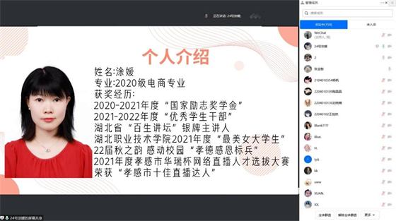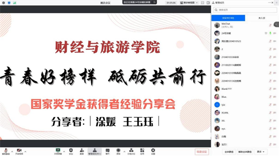 为进一步增强学风建设,充分发挥国家奖学金获得者优秀榜样力量,12月4日晚,yl23411永利集团举行了以“青春好榜样,砥砺共前行”为主题的2022年国家奖学金获得者线上经验交流分享会。本次分享会由涂媛、王玉珏两位优秀获奖者主讲,学院全体在校学生参加会议。