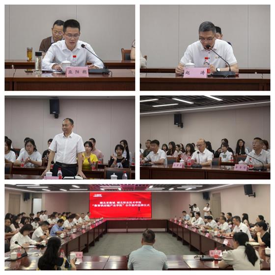 湖北首衡城农副公司总经理赵涛讲话。他表示,通过校企合作和“数智供应链产业学院”的建设,更好地发挥企业优势,为学院和广大同学提供一个非常良好的学习和实践平台。大力推进校企合作战略,将进一步促进产业升级、加快人才资源结构调整。产业学院将人才培养、教师专业发展、学生实训实习、创新创业、企业服务科技创新功能有机结合,促进产教融合、科教融汇,将产业学院打造成为集产、学、研、转、创、用于一体,互补、互动、多赢的实体性人才培养新平台。