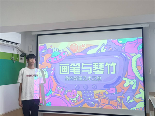 随后,来自23040701班的高家棋同学带来了关于艺术抉择的动人故事。因为对音乐的独特热爱,他毅然放下研习多年的画笔,转而执起琴竹,开启了扬琴艺术的新征程。日复一日的刻苦练习,即使疲惫也从不言弃,这份执着让他的演奏技艺日益精进。如今,他活跃在校内各大舞台,用琴声诉说热爱,未来也将继续在音乐道路上坚定前行。