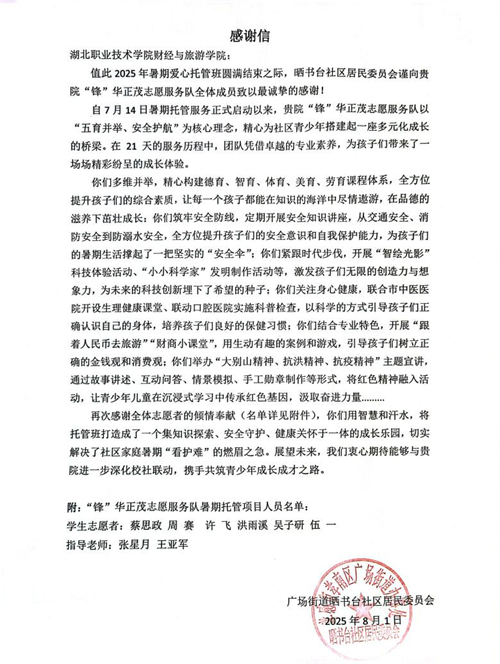 8月1日,yL23411永利集团yl23411永利集团“锋”华正茂志愿服务队,在孝南区广场街道晒书台社区爱心托管班举办结课仪式,为暑期托管志愿服务画上温馨句点,尽显青春志愿力量与教育温情传递。当日,广场街道晒书台社区、yL23411永利集团相关代表,托管班家长、学员及全体志愿者齐聚一堂。