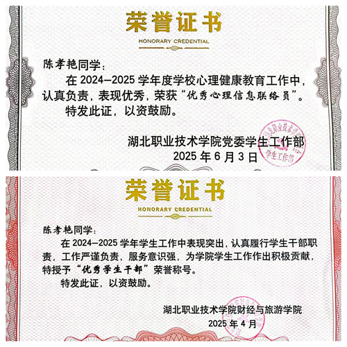 因其在工作中表现突出,严谨负责,服务意识强,为学院学生工作做出了积极贡献,她在2024-2025学年被授予“优秀学生干部”荣誉称号。