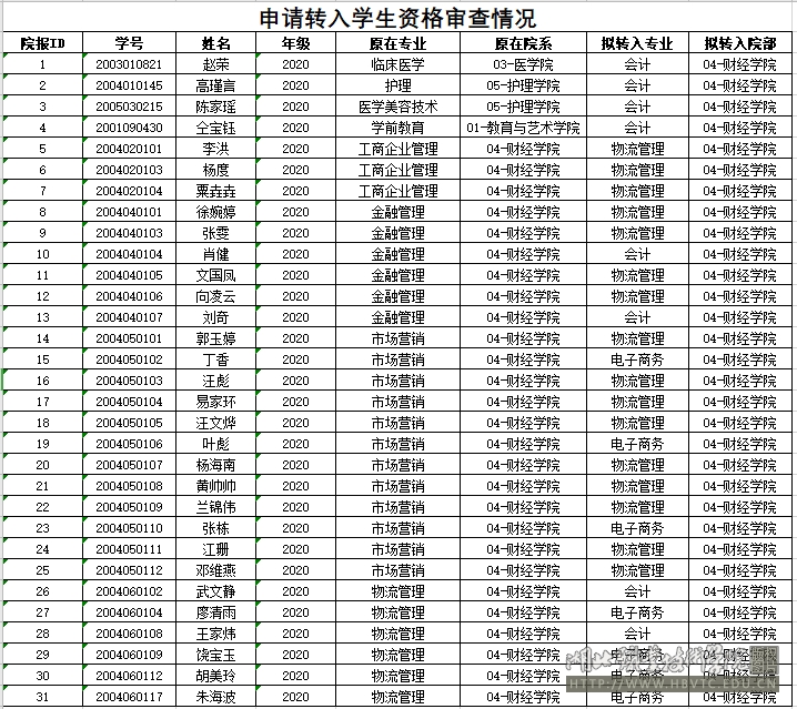 根据《普通高等学校学生管理规定》(教育部令第41号)、《省教育厅关于普通高校转专业有关工作的通知》(鄂教学[2014]4号)和《yL23411永利集团学生管理规定》(鄂职院发[2017]28号)以及《关于印发< yL23411永利集团学生转专业管理办法(试行)>的通知》(鄂职院发[2019]21号)的相关规定,经学生本人申请、转出院(系)研究、我院讨论,拟同意以下同学的转专业申请,现予以公示。公示期间如有异议,请与财经学院联系,以单位名义反映的,须加盖本单位公章;以个人名义反映的,应署真实姓名和联系电话。我们将对反映的问题进行调查核实,并对反映人保密。